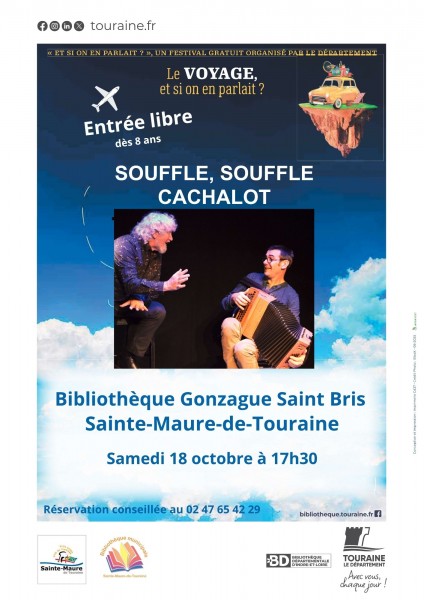 La Bibliothèque municipale Gonzague Saint Bris à Sainte-Maure-de-Touraine accueille, le samedi 18 octobre à 17h30, le spectacle Souffle, souffle cachalot, proposé dans le cadre du festival « Et si on en parlait ? », organisé par le Département d’Indre-et-Loire.